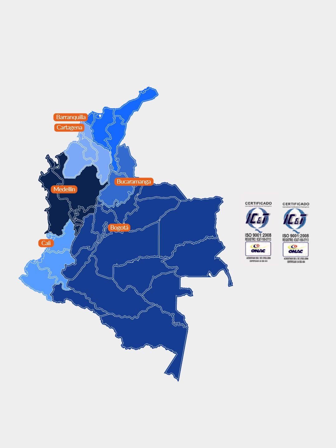 Tenemos presencia nacional con oficinas en Medellín, Barranquilla, Bogotá, Cali, Cartagena y Bucaramanga.